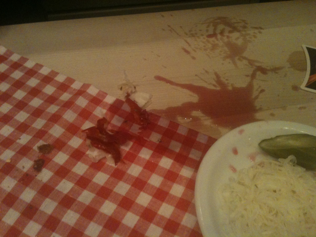 Mimo próśb nikt tego nie sprząta – a poleciało również na ławkę, na której siedziała moja luba oraz oczywiście na nas! Serwetek na stole brak, stąd nie mamy czym tego wytrzeć, chociaż z ławki. Wyginając się niczym akrobata w cyrku opuszczamy swoje miejsca starając się nie ubrudzić.