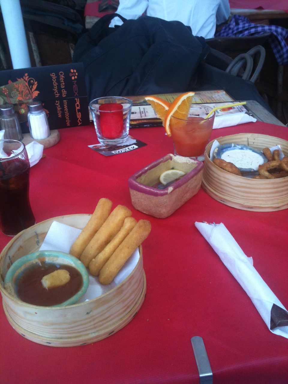 Ja zamówiłem paluszki serowe, moja M. – panierowane kalmary. Na stole pojawiło się również naczynie z plasterkiem cytryny do obmycia rąk – fajny patent, szczególnie po jedzeniu kalmarów 😉