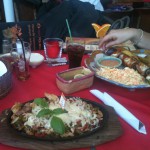 Jak skończyliśmy pałaszować to co widać na górnej fotce kelner zabrał brudne naczynia i po kilkunastu minutach podano dania główne. Dla mnie Fajitas, dla M. szaszłyk drobiowy. Obydwa dania podane na fikuśnych – kamionkowych naczyniach. Do Fajitas dostałem koszyczek z tortillami pszennymi i dowcipną ulotką jak się je przy pomocy placka tortilli…