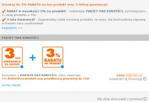 Złożenie zamówienia w tym sklepie stało się ostatnimi czasu trudne przez potykacze w postaci konieczności przebrnięcia przez nieudolne próby sprzedaży krzyżowej: ciągłe wciskanie mi dodatkowego ubezpieczenia i innych bzdur. Co ciekawe pakiet korzyści jak to nazwał electro.pl wraz z super rabatem wypada drożej niż zakup bez rabatu 😉 Ale pewnie sporo osób nie doczyta i skusi się na te ich korzyści. Słono płatne korzyści…