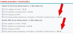 W końcu definitywnie zrezygnowałem z dodatkowych usług i udało mi się przejść do definiowania płatności i wyboru sposobu dostawy.
