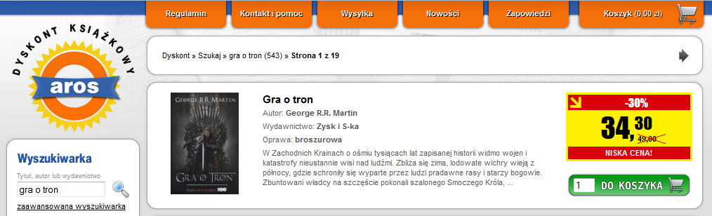 Trafiłem tam w poszukiwaniu serii wydawniczej Gry o Tron, jaki wymarzyła sobie moja Chrześnica. Oczywiście pierwsze miejsce gdzie się skierowałem przy okazji wizyty w jednym z łódzkich centr handlowych był Empik – jak się okazało wszystkie 4 książki leżały na półce. Szczęśliwy, że nie muszę szukać dalej chciałem je od razu kupić, ale w tym momencie odezwał się mój wąż w kieszeni – Andrzejuuuuuuu, nie sprawdzisz ceny w internecie? Powiedział to na tyle głośno, że pół minutowe poszukiwania zaowocowały prawie 10% niższa ceną w tym samym Empiku – ale przy zamówieniu przez ich e-sklep i oczywiście odbiorze w tej samej placówce stacjonarnej, w której właśnie jestem. Ale nie o Empiku będzie mowa w tym wpisie, a o ich konkurencji. Wieczorem gdy wróciłem do domu w spokoju domowego ciepełka i bez setek ludzi nacierających z każdej strony w centrach handlowych zacząłem szukać w internecie konkurencyjnych sklepów. Trafiłem tym samym na sklep Aros.pl zaciekawiony właśnie ich hasłem dyskontu książkowego. Wizualnie sklep rzeczywiście przypomina dyskonty, nawet wirtualne przywieszki cenowe wyglądają jak z marketu czy dyskontu: