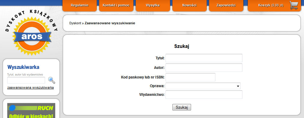 Małym minusem w layout tego sklepu jest brak możliwości filtrowania. Mogę oczywiście skorzystać z zaawansowanego wyszukiwania, ale nie mam możliwości filtrowania z poziomu strony głównej czy stron produktowych.tak podstawowych informacji jak oprawa (twarda vs. miękka), rodzaj wydania itp. Takie opcje filtrowania powinny być widoczne od razu co znacząco ułatwi szybkie znalezienie interesującej nas pozycji książkowej. Przydałaby się jeszcze kategoryzacja po wieku/płci – idealna w sytuacji gdy szukamy książki na prezent nie do końca wiedząc jeszcze jaki tytuł nas interesuje. Podejrzewam, że twórcy tego sklepu wyszli z założenia, że Klient, który ich odwiedzi wie już jakiego tytułu szuka i należy go skusić ceną, a ta naprawdę w ich przypadku akurat na interesujących mnie tytułach była rewelacyjna. W stacjonarnej księgarni książka kosztowała 50 zł bez grosza – w sklepie Aros.pl 15 zł mniej – to jest 30% taniej! W sytuacji, kiedy kupowałem 4 sztuki daje to tak naprawdę jedną książkę i wysyłkę gratis, także warto się schylić po taki rabat moim zdaniem.