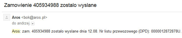 Kolejnym miłym zaskoczeniem był termin realizacji. Zamówienie złożone o 6 rano a już o godzinie 18 tego samego dnia przyszła informacja o zmianie statusu zamówienia na wysłane. Wiadomość e-mail z ta informacją była delikatnie mówiąc krótka, ale rzeczowa 🙂